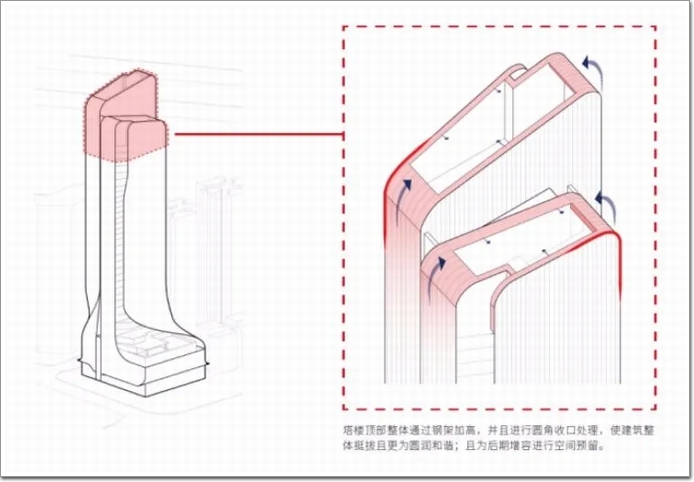 形態的生成以建筑核心筒為軸心,向南北分成兩個體塊,東西錯開一個柱跨,外立面以“帆”之理念塑造,順勢而下,輕盈落于裙樓之上,形成雨棚空間,巧妙地將建筑的裙樓和塔樓融為整體,以自然有機的形態點綴著城市的天際線。