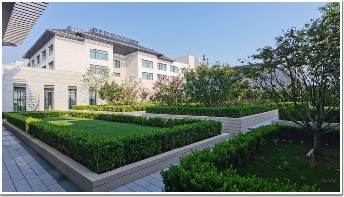 濃厚古典中式風格的攬月庭由金屬屋面、鋁板和金屬格柵線條系統打造,在此可極目遠望園林景觀。