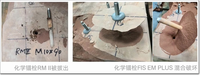 2)150mm厚石材,錨固深度為90mm時,RM II和FIS EM PLUS化學錨栓在花崗石上均為螺桿被拉斷;在紅砂巖上RM II化學錨栓為錨栓拔出破壞,FIS EM PLUS化學錨栓為混合破壞;