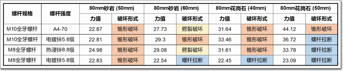 1)花崗石上的破壞形式為石材錐形破壞或螺桿被拉斷,承載力比較穩定;