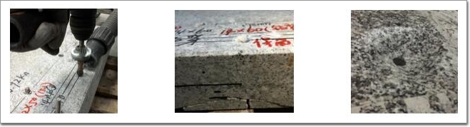 分別在花崗石和紅砂巖上鉆孔,由于花崗石強度高,紅砂巖強度低,非常明顯在花崗石上的鉆孔比較耗時耗力。