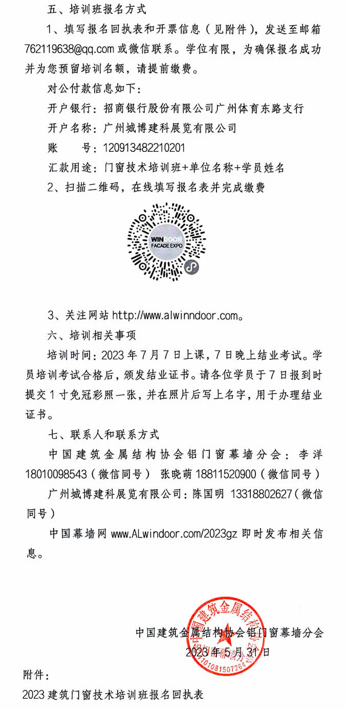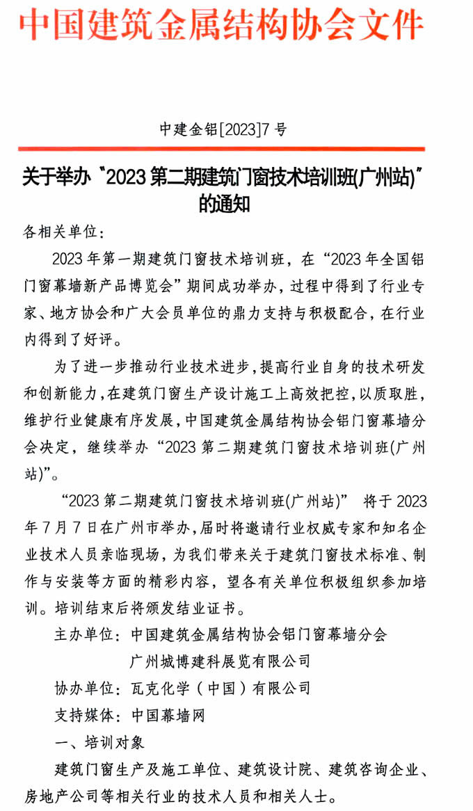 關于舉辦“2023第二期建筑門窗技術培訓班(廣州站)”的通知