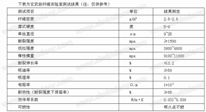 下表為玄武巖纖維實驗室測試結(jié)果(注:僅供參考)