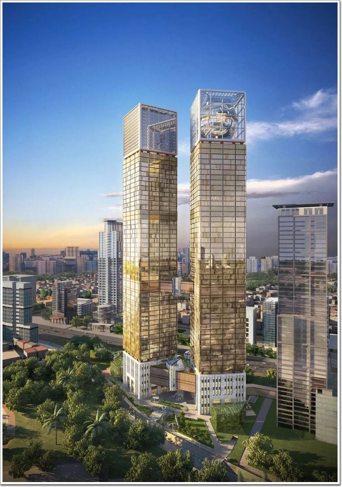 在都市的繁華織錦中,身披華麗幕墻表皮直沖云端的超高層雙子塔,如同兩顆璀璨的星辰,瞬間聚焦萬千目光。它們并肩而立,高度相近,形態相仿,猶如孿生兄弟,在城市的天際線上閃耀生輝。