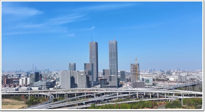 南昌綠地中心雙子塔作為南昌的標志性建筑之一,是江西第一高樓、中國中部最高雙子塔。兩棟303米的超高層建筑如雙星閃耀,設計靈感來源于南昌市市花——金邊瑞香。建筑提取金邊瑞香獨特的造型,并將其運用于塔冠,幕墻采用了冷彎玻璃面板,使得大廈呈現出波浪形的輪廓,賦予雙子塔藝術的美感。