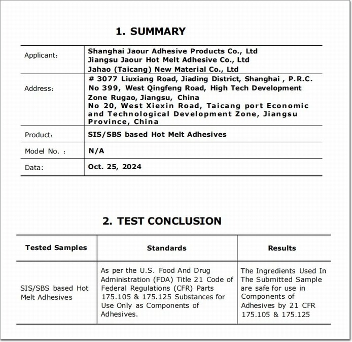 嘉好熱熔(詞條“熱熔”由行業大百科提供)膠FDA認證證書部分截圖