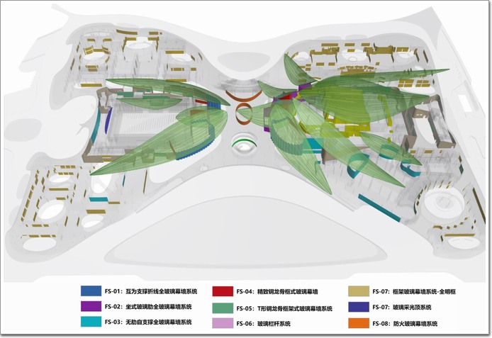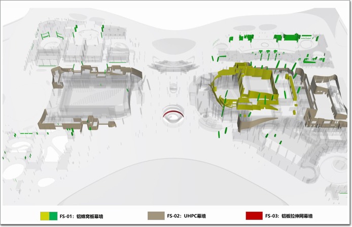 項目坐落于浙江安吉,總建筑面積約 12 萬㎡,涵蓋 1300 座大劇院、2000人會議中心等核心功能,肩負著銜接西側(cè)自然山體與東側(cè)城市空間的 “過渡載體” 使命。建筑方案以安吉 “中國竹鄉(xiāng)” 的自然稟賦為起點,確立 “竹葉靈動”“茶田見山”“融于自然” 三大理念,幕墻則是通過 8 類玻璃幕墻系統(tǒng)(FS-01 至 FS-08)與 3 類非透光幕墻系統(tǒng)(鋁蜂窩板(詞條“鋁蜂窩板”由行業(yè)大百科提供)、UHPC、鋁板拉伸網(wǎng)),以及“葉片”的3類裝飾屋面系統(tǒng)的協(xié)同應(yīng)用,讓建筑從形態(tài)到功能都深度呼應(yīng)地域特色。