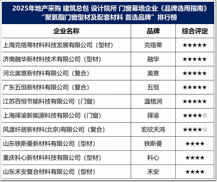 在房地產(chǎn)與建筑業(yè),除重點(diǎn)關(guān)注門窗主流產(chǎn)品、幕墻核心系統(tǒng)外,也將更多的目光延申到未來發(fā)展趨勢(shì)上,本期中國(guó)幕墻網(wǎng)ALwindoor.com更是以材料新趨勢(shì)——“聚氨酯”類別,呈現(xiàn)2025年度市場(chǎng)首選的“高端聚氨酯型材”品牌。