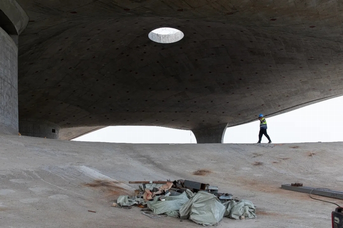 建筑方案以“河流三角洲”為靈感,由五個錐形結構構成主體,寬闊的走廊與公共設施形成流暢動線,將圓錐體形的大廳與展廳包裹其中,發展出高低起伏、彎曲多變的建筑形態。建筑外立面以直紋斜面石材作為主要材質,如同天然形成的“海蝕崖”肌理,體現出與自然融合的內涵及氣質。