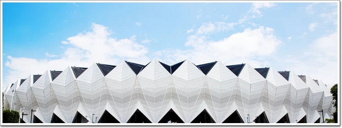 南平體育中心的外觀設計結合了“武夷茶花”的構思理念,用民間折紙的設計手法構造兩座“武夷茶花”造型的建筑,立面中每榀如同一只“千紙鶴”的翅膀,幾十只翅膀串連起來,猶如一朵盛開的白色“武夷茶花”。