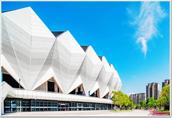 再則,體育場館外幕墻采用異形沖孔鋁復合板,屋面采用鋁鎂錳板+陽光板,整體外觀呈現“粉墻黛瓦”的民族建筑風格。