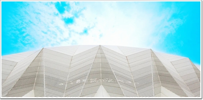 其中,外幕墻全部采用多孔徑復合鋁板,孔徑隨幕墻高度不斷變化,外幕墻總共分為104跨,每跨由不同規格菱形復合鋁板拼接而成。